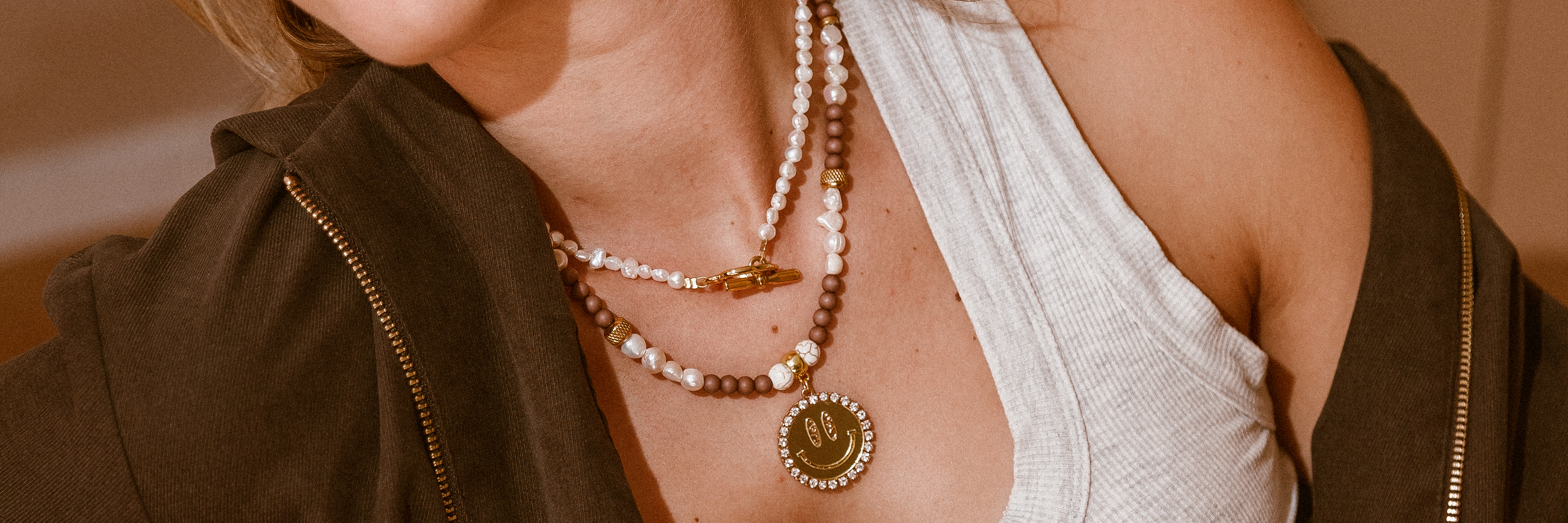 Ketting Kralen Smiley Gold- Beige/brown